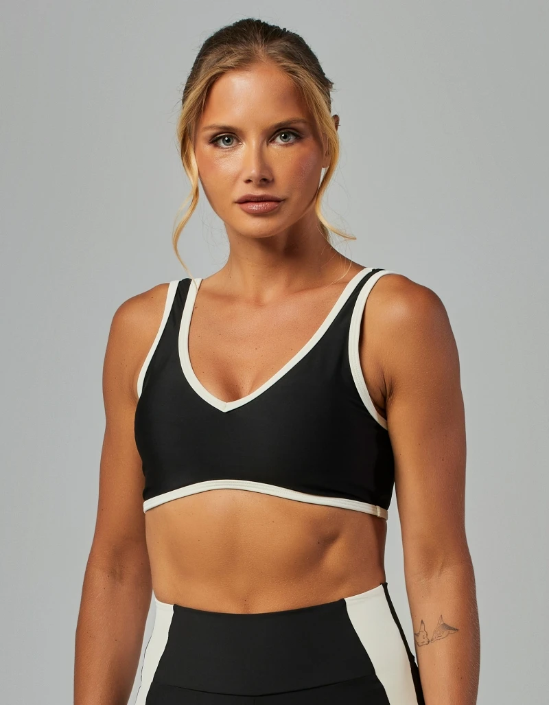 The Wellness Bicolor Medium Support Top features contrasting color stripes, which, together with the 'V' neckline, enhance the body and bring identity to the piece.